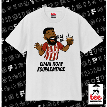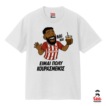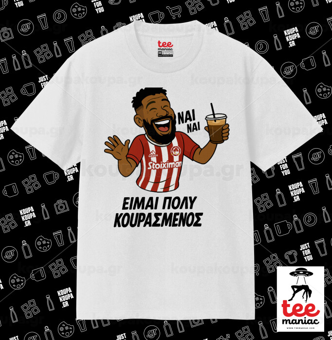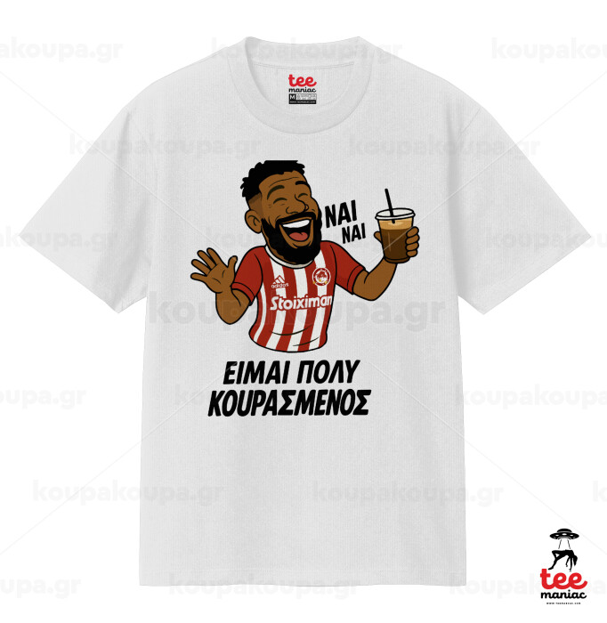 Ροντινέι, "ΠΟΛΥ ΚΟΥΡΑΣΜΕΝΟΣ", Κλασικό T-Shirt, διπλής ραφής, χωρίς πλευρικές ραφές ΛΕΥΚΟ από 100% βαμβάκι. Vegan & OEKO-TEX πιστοποιημένο.