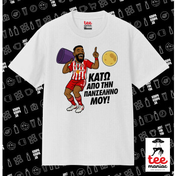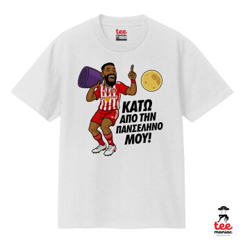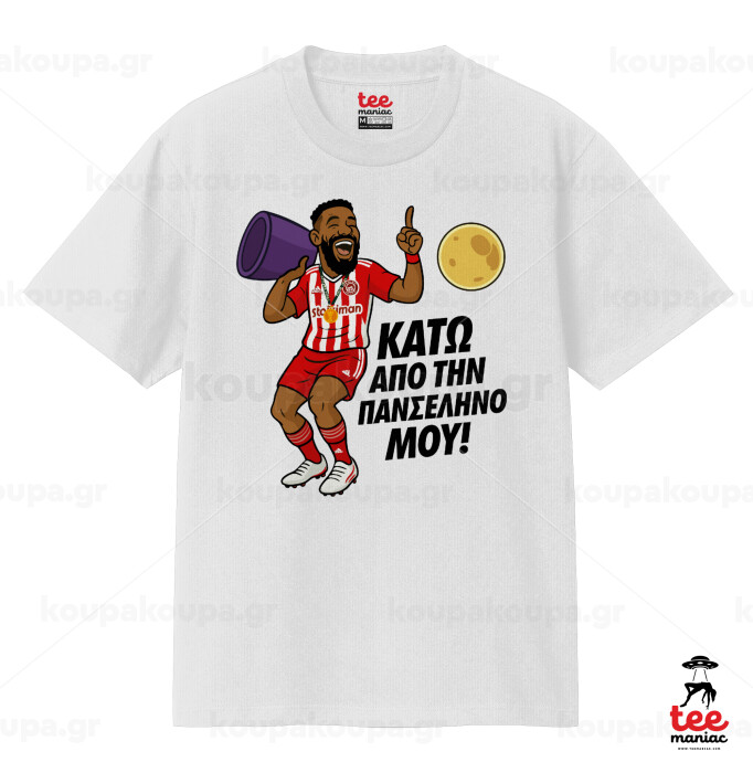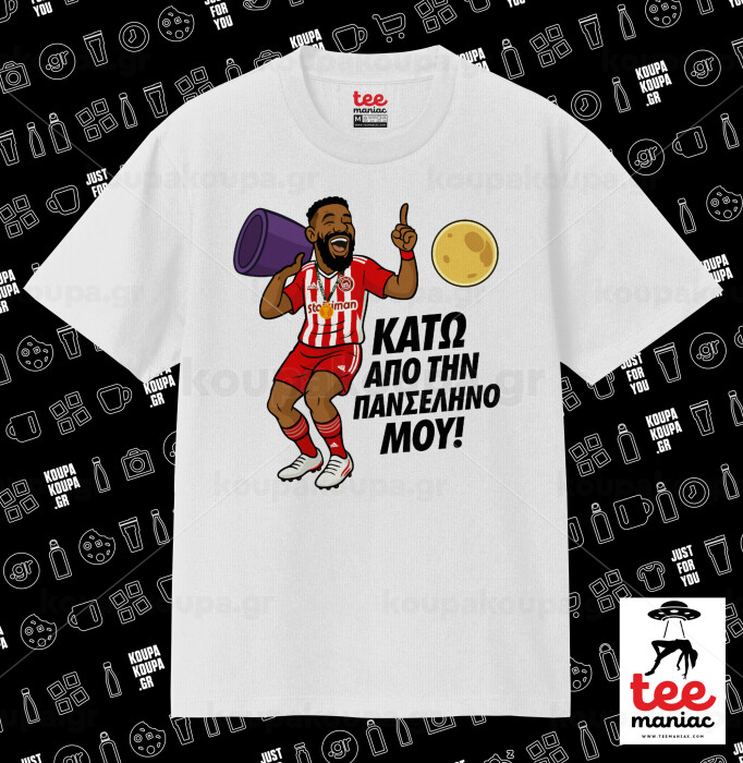 Ροντινέι, "ΚΑΤΩ ΑΠΟ ΤΗΝ ΠΑΝΣΕΛΗΝΟ ΜΟΥ!", Κλασικό T-Shirt, διπλής ραφής, χωρίς πλευρικές ραφές ΛΕΥΚΟ από 100% βαμβάκι. Vegan & OEKO-TEX πιστοποιημένο.