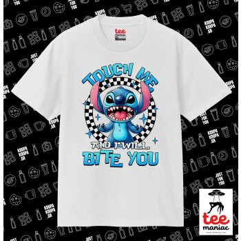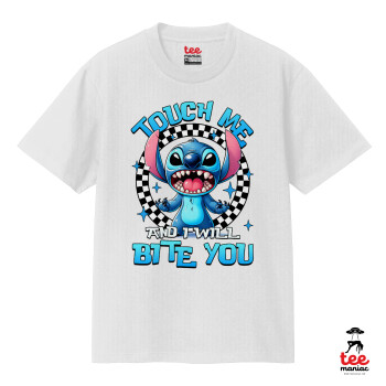 Stitch Touch Me And I Will Bite You, Κλασικό T-Shirt, διπλής ραφής, χωρίς πλευρικές ραφές ΛΕΥΚΟ από 100% βαμβάκι. Vegan & OEKO-TEX πιστοποιημένο.