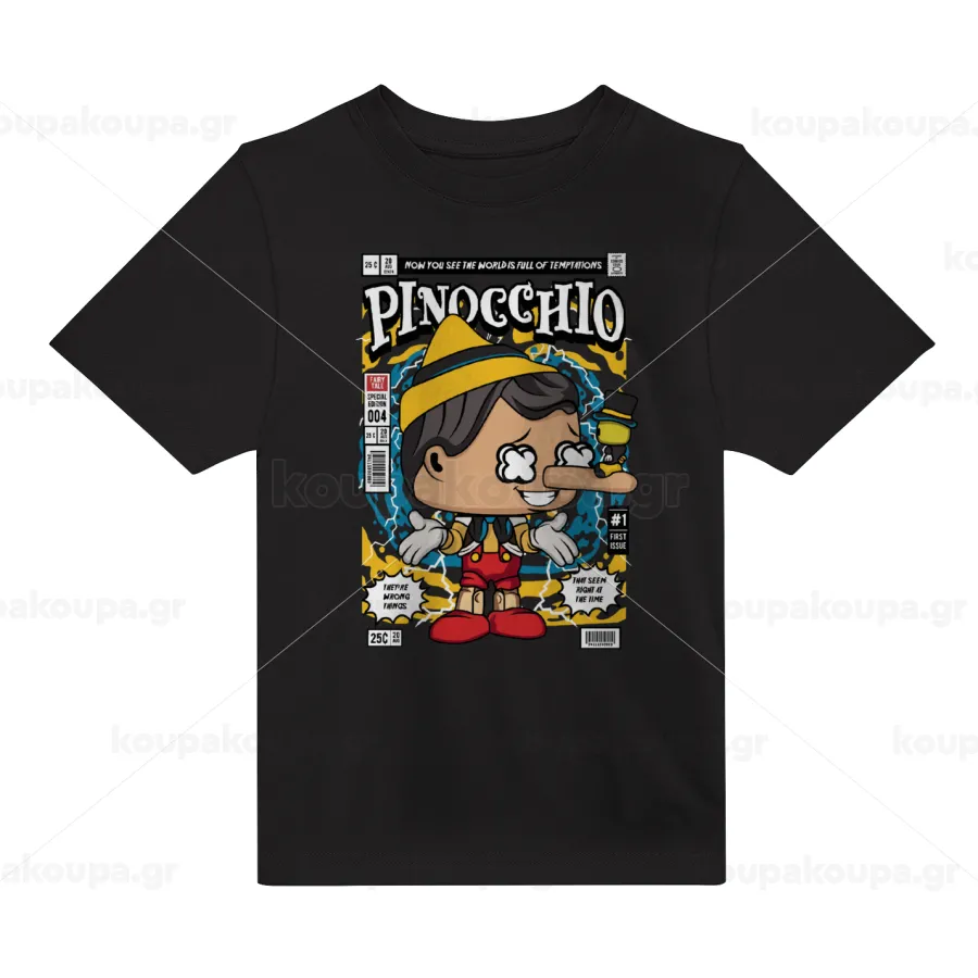 Pinocchio, Άνετο παιδικό T-Shirt ΜΑΥΡΟ από 100% βαμβάκι, για κάθε μέρα. Vegan & OEKO-TEX πιστοποιημένο.