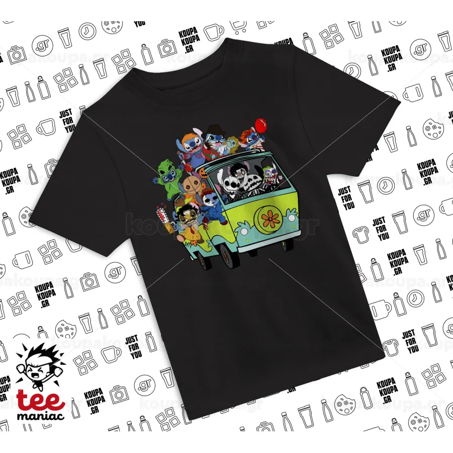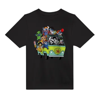 Stitch Halloween scooby car, Άνετο παιδικό T-Shirt ΜΑΥΡΟ από 100% βαμβάκι, για κάθε μέρα. Vegan & OEKO-TEX πιστοποιημένο.