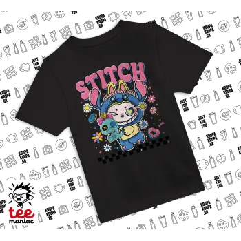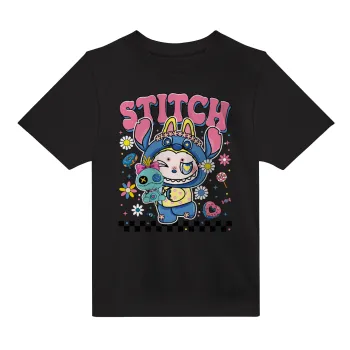 Labubu Stitch, Άνετο παιδικό T-Shirt ΜΑΥΡΟ από 100% βαμβάκι, για κάθε μέρα. Vegan & OEKO-TEX πιστοποιημένο.
