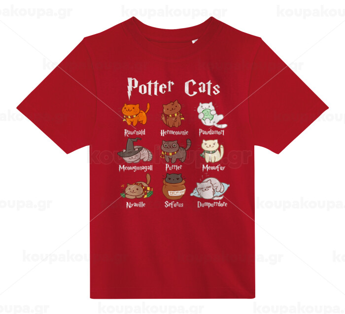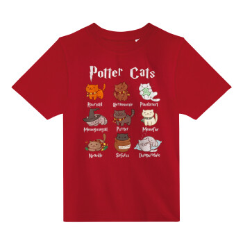Potter Cats, Άνετο παιδικό T-Shirt ΚΟΚΚΙΝΟ από 100% βαμβάκι, για κάθε μέρα. Vegan & OEKO-TEX πιστοποιημένο.
