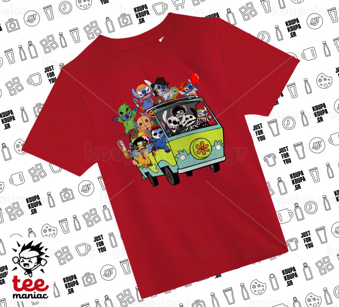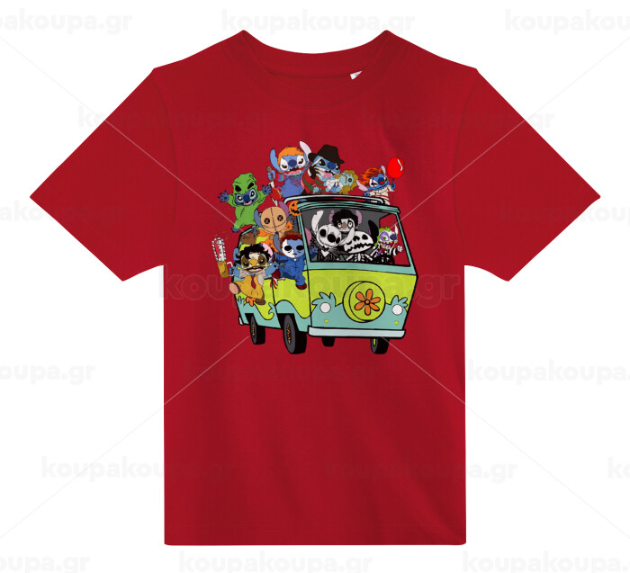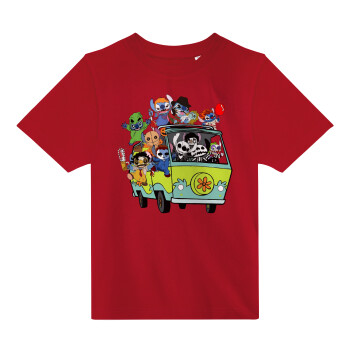 Stitch Halloween scooby car, Άνετο παιδικό T-Shirt ΚΟΚΚΙΝΟ από 100% βαμβάκι, για κάθε μέρα. Vegan & OEKO-TEX πιστοποιημένο.
