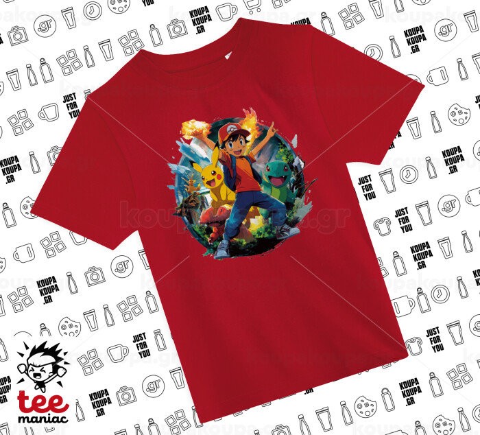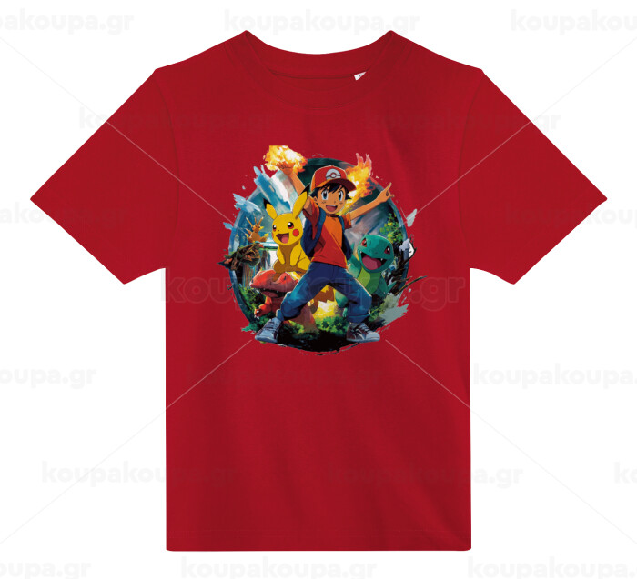 Ash Ketchum & Pikachu, Άνετο παιδικό T-Shirt ΚΟΚΚΙΝΟ από 100% βαμβάκι, για κάθε μέρα. Vegan & OEKO-TEX πιστοποιημένο.