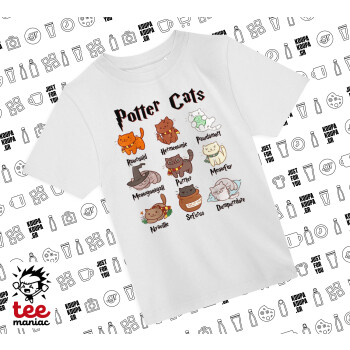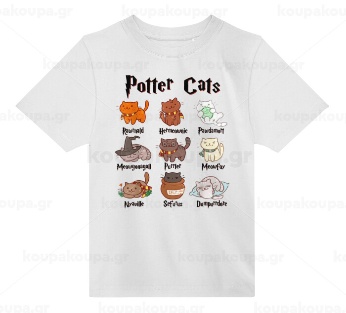 Potter Cats, Άνετο παιδικό T-Shirt ΛΕΥΚΟ από 100% βαμβάκι, για κάθε μέρα. Vegan & OEKO-TEX πιστοποιημένο.