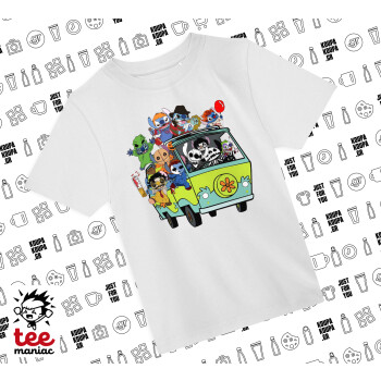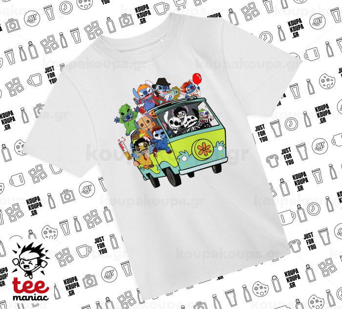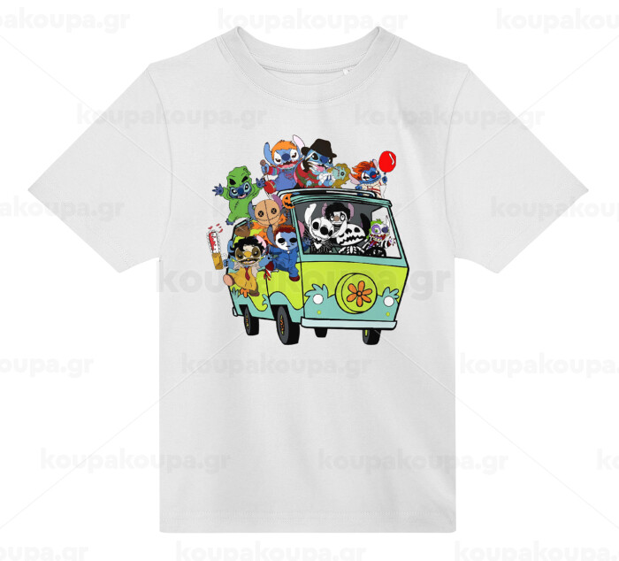 Stitch Halloween scooby car, Άνετο παιδικό T-Shirt ΛΕΥΚΟ από 100% βαμβάκι, για κάθε μέρα. Vegan & OEKO-TEX πιστοποιημένο.