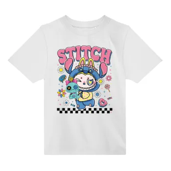 Labubu Stitch, Άνετο παιδικό T-Shirt ΛΕΥΚΟ από 100% βαμβάκι, για κάθε μέρα. Vegan & OEKO-TEX πιστοποιημένο.