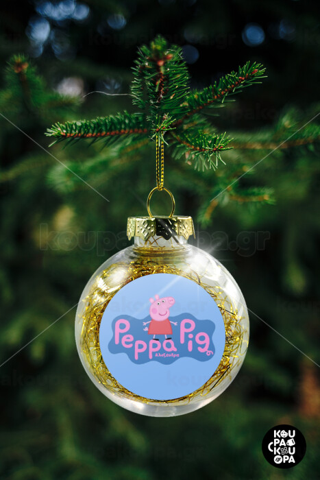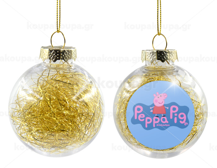 Πέππα το γουρουνάκι μπλε με όνομα, Στολίδι Χριστουγεννιάτικη μπάλα δένδρου διάφανη με χρυσό γέμισμα 8cm