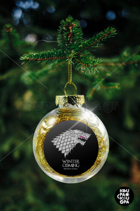 GOT House of Starks, winter coming, Στολίδι Χριστουγεννιάτικη μπάλα δένδρου διάφανη με χρυσό γέμισμα 8cm