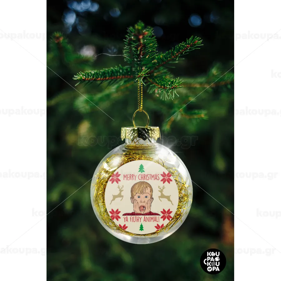 home alone, Merry Christmas ya filthy animal, Στολίδι Χριστουγεννιάτικη μπάλα δένδρου διάφανη με χρυσό γέμισμα 8cm