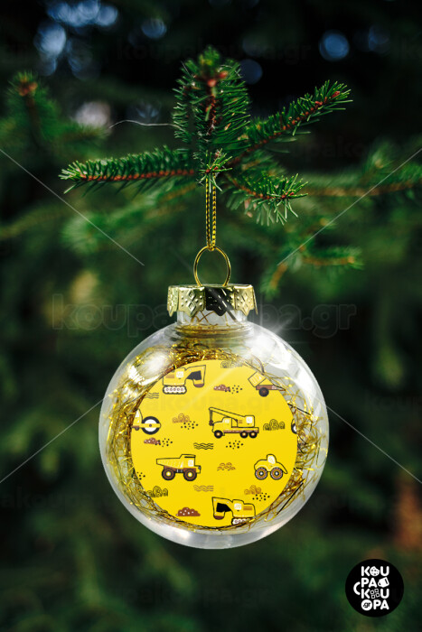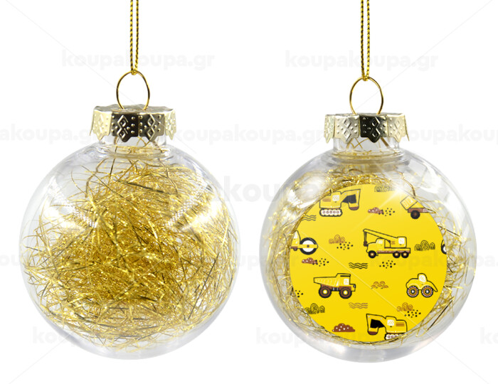 Αμαξάκια φορτωτές και μπουλντόζες, Στολίδι Χριστουγεννιάτικη μπάλα δένδρου διάφανη με χρυσό γέμισμα 8cm