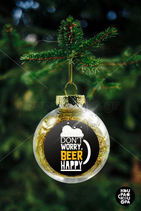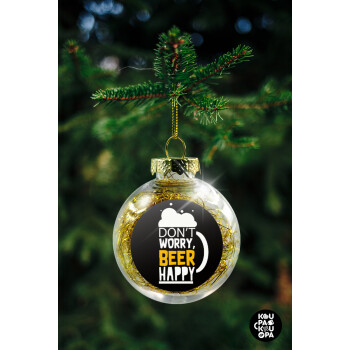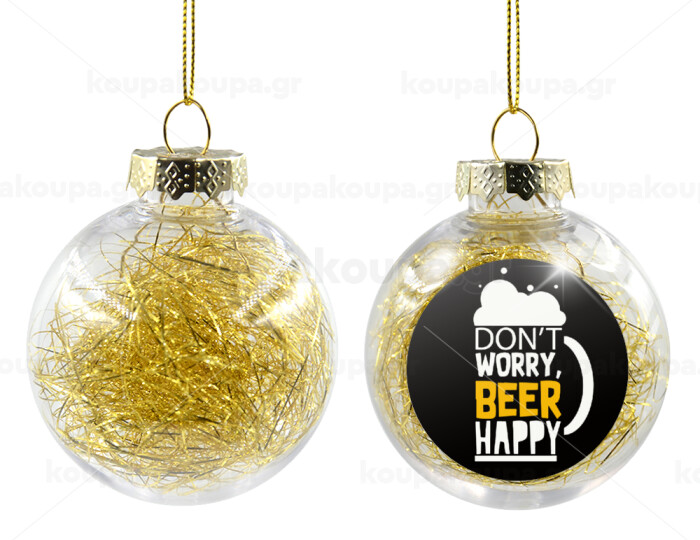 Don't worry BEER Happy, Στολίδι Χριστουγεννιάτικη μπάλα δένδρου διάφανη με χρυσό γέμισμα 8cm