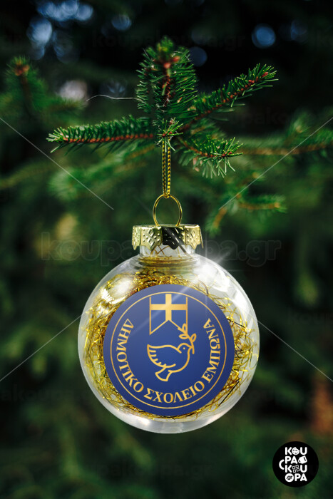 Έμβλημα Σχολικό μπλε με χρυσό, Στολίδι Χριστουγεννιάτικη μπάλα δένδρου διάφανη με χρυσό γέμισμα 8cm