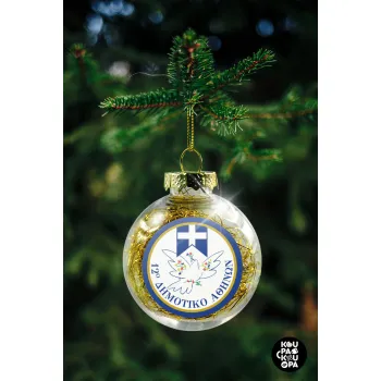 Σχολικό σήμα περιστέρι με δάφνες, Στολίδι Χριστουγεννιάτικη μπάλα δένδρου διάφανη με χρυσό γέμισμα 8cm