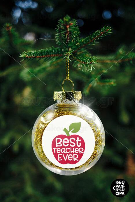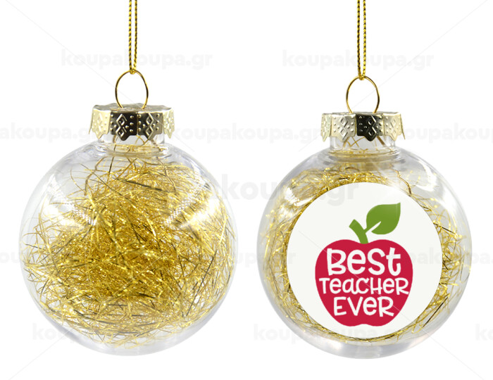 best teacher ever, apple!, Στολίδι Χριστουγεννιάτικη μπάλα δένδρου διάφανη με χρυσό γέμισμα 8cm