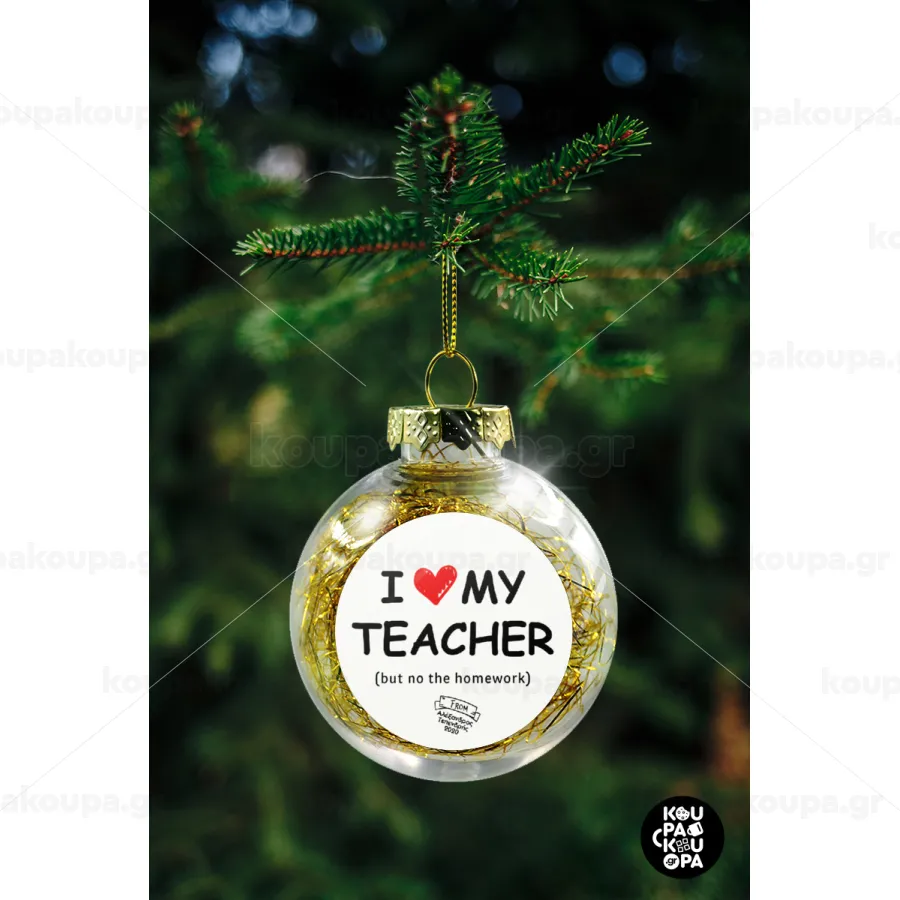i love my teacher but no the homework, Στολίδι Χριστουγεννιάτικη μπάλα δένδρου διάφανη με χρυσό γέμισμα 8cm
