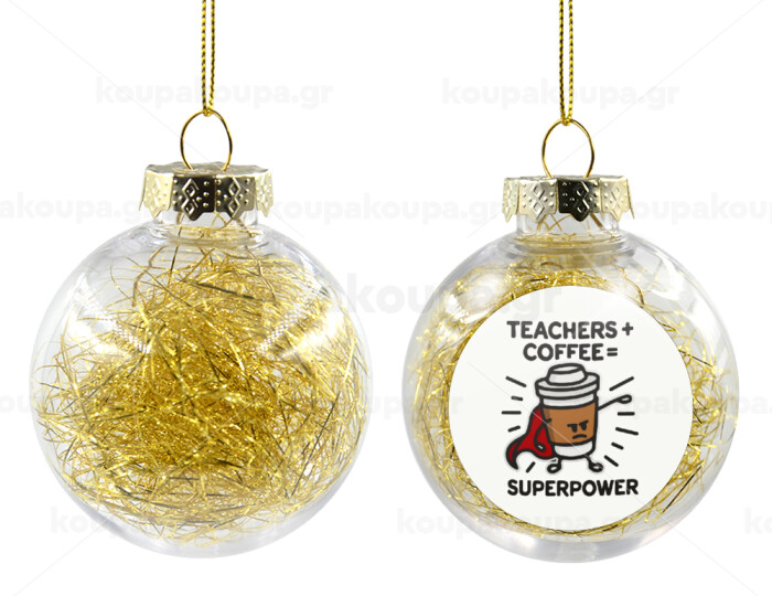 Teacher Coffee Super Power, Στολίδι Χριστουγεννιάτικη μπάλα δένδρου διάφανη με χρυσό γέμισμα 8cm
