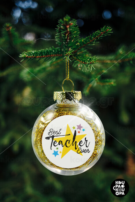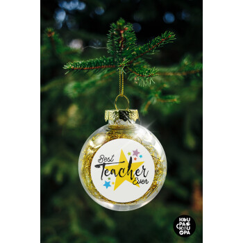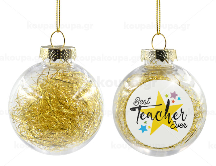 Teacher super star!!!, Στολίδι Χριστουγεννιάτικη μπάλα δένδρου διάφανη με χρυσό γέμισμα 8cm