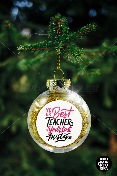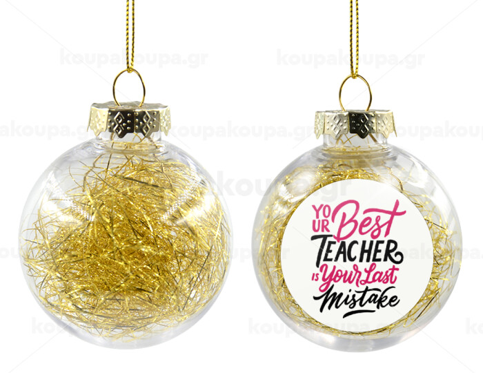 Typography quotes your best teacher is your last mistake, Στολίδι Χριστουγεννιάτικη μπάλα δένδρου διάφανη με χρυσό γέμισμα 8cm