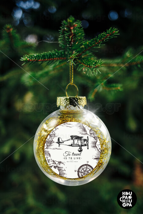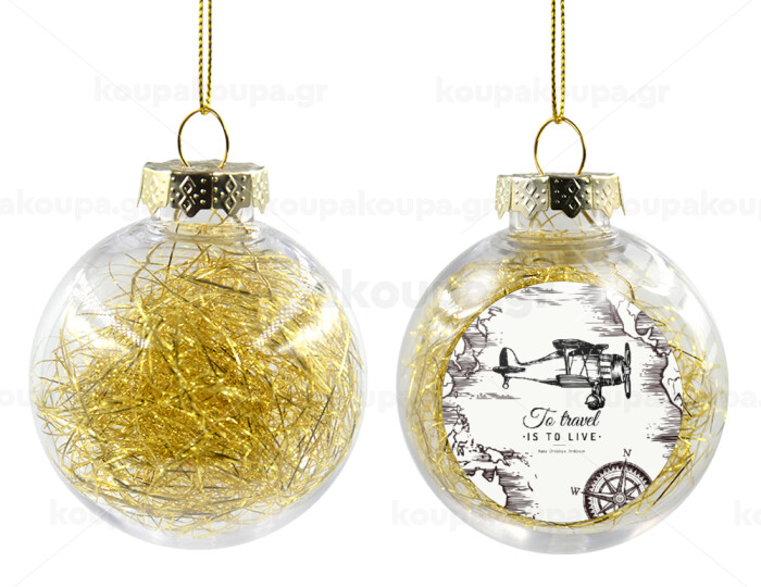 To travel is to live, Στολίδι Χριστουγεννιάτικη μπάλα δένδρου διάφανη με χρυσό γέμισμα 8cm