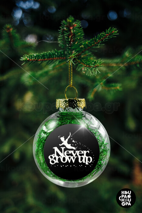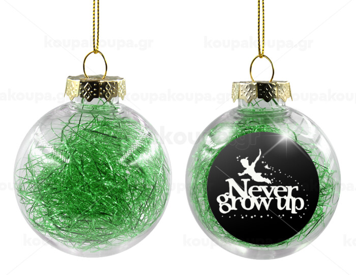 Peter pan, Never Grow UP, Στολίδι Χριστουγεννιάτικη μπάλα δένδρου διάφανη με πράσινο γέμισμα 8cm