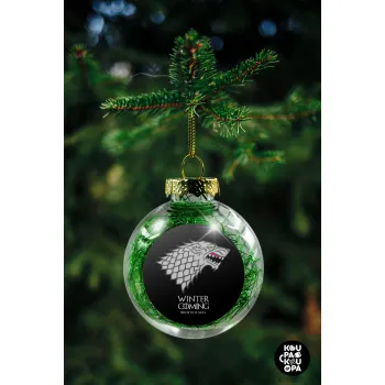 GOT House of Starks, winter coming, Στολίδι Χριστουγεννιάτικη μπάλα δένδρου διάφανη με πράσινο γέμισμα 8cm