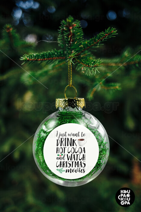 I just want to drink hot cocoa and watch christmas movies, Στολίδι Χριστουγεννιάτικη μπάλα δένδρου διάφανη με πράσινο γέμισμα 8cm