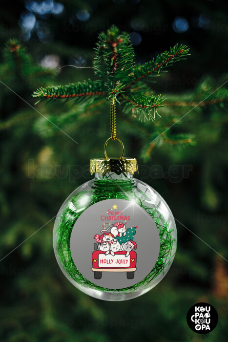 Merry Christmas cats in car, Στολίδι Χριστουγεννιάτικη μπάλα δένδρου διάφανη με πράσινο γέμισμα 8cm