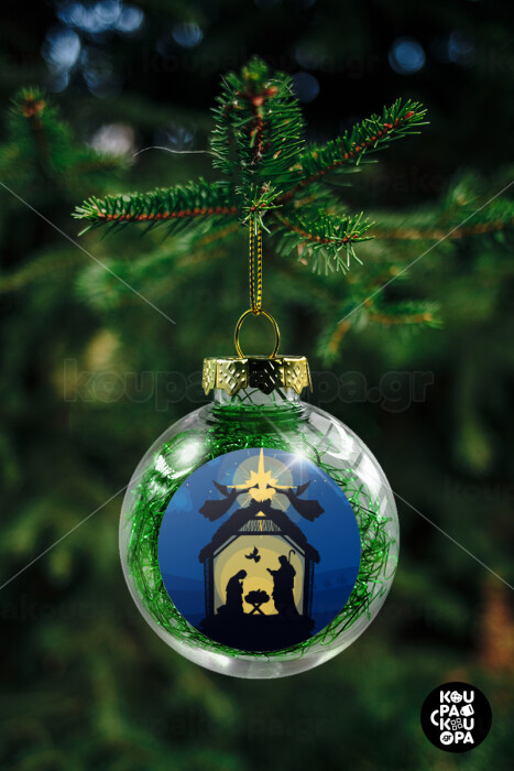 Η γέννηση του Ιησού φάτνη, Στολίδι Χριστουγεννιάτικη μπάλα δένδρου διάφανη με πράσινο γέμισμα 8cm