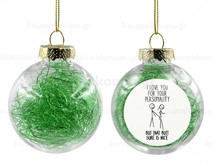 I Love you for your personality, Στολίδι Χριστουγεννιάτικη μπάλα δένδρου διάφανη με πράσινο γέμισμα 8cm