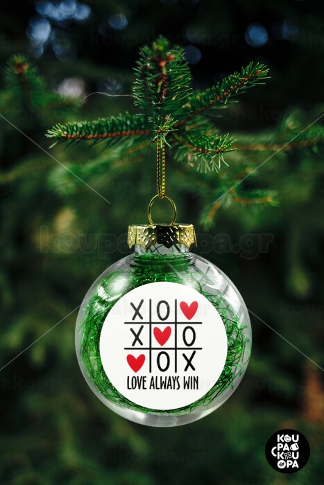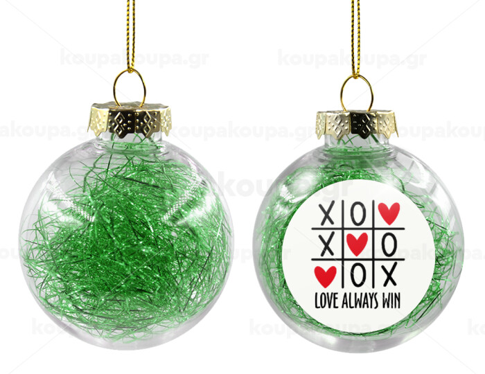 Love always win, Στολίδι Χριστουγεννιάτικη μπάλα δένδρου διάφανη με πράσινο γέμισμα 8cm