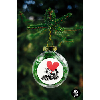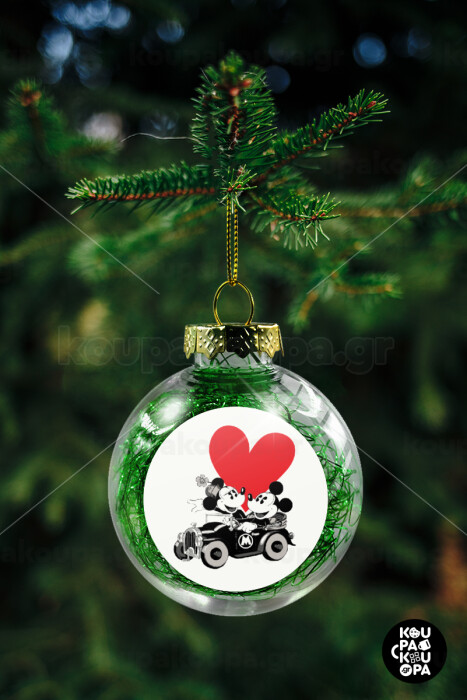 Mickey & Minnie love car, Στολίδι Χριστουγεννιάτικη μπάλα δένδρου διάφανη με πράσινο γέμισμα 8cm