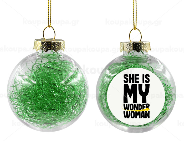 She is my wonder woman, Στολίδι Χριστουγεννιάτικη μπάλα δένδρου διάφανη με πράσινο γέμισμα 8cm