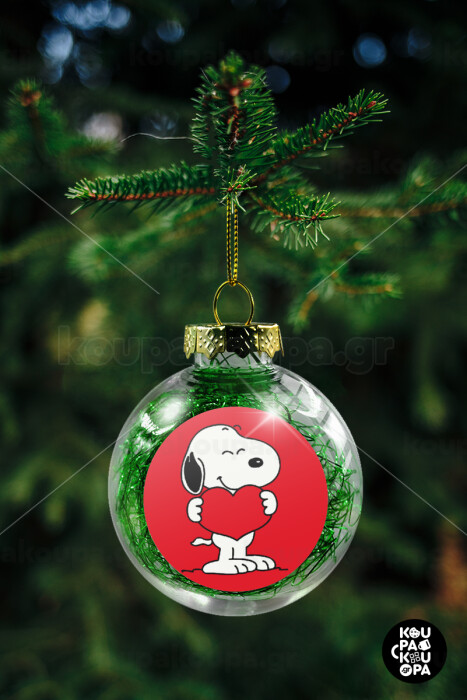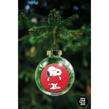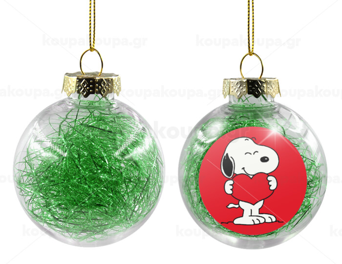 Snoopy takemy heart, Στολίδι Χριστουγεννιάτικη μπάλα δένδρου διάφανη με πράσινο γέμισμα 8cm