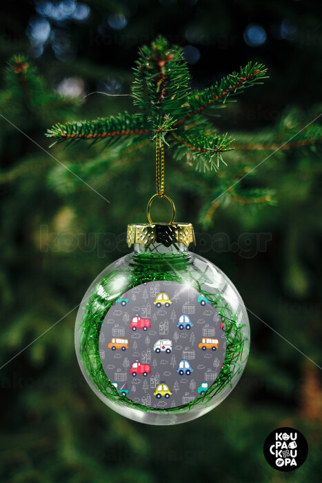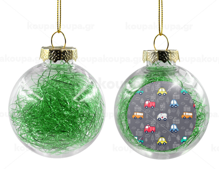 Hand drawn childish set with cars, Στολίδι Χριστουγεννιάτικη μπάλα δένδρου διάφανη με πράσινο γέμισμα 8cm