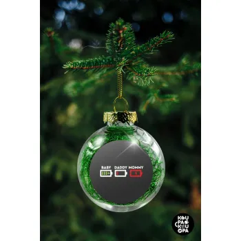 BABY, MOMMY, DADDY Low battery, Στολίδι Χριστουγεννιάτικη μπάλα δένδρου διάφανη με πράσινο γέμισμα 8cm