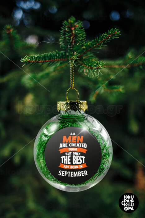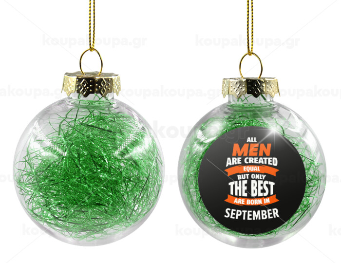 All men are created equal but only the best are born in September, Στολίδι Χριστουγεννιάτικη μπάλα δένδρου διάφανη με πράσινο γέμισμα 8cm