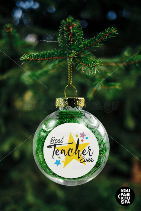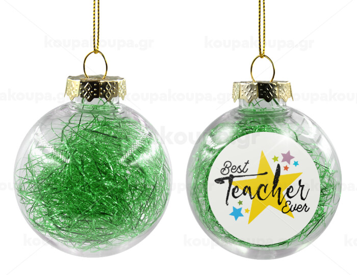 Teacher super star!!!, Στολίδι Χριστουγεννιάτικη μπάλα δένδρου διάφανη με πράσινο γέμισμα 8cm