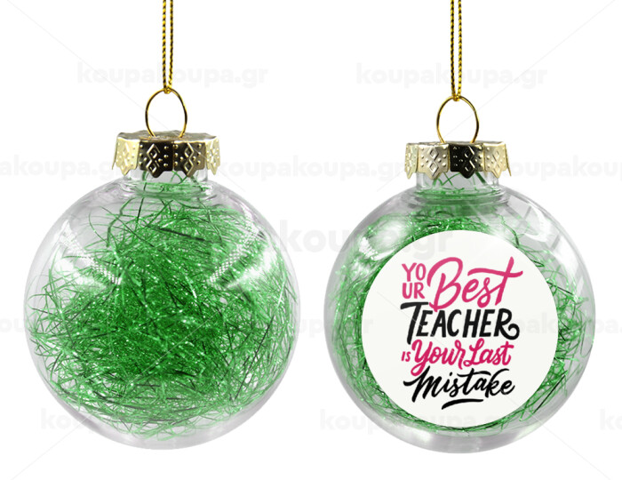 Typography quotes your best teacher is your last mistake, Στολίδι Χριστουγεννιάτικη μπάλα δένδρου διάφανη με πράσινο γέμισμα 8cm
