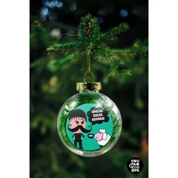Κρητικός "Έρχεται Πάσχα κουράδι", Στολίδι Χριστουγεννιάτικη μπάλα δένδρου διάφανη με πράσινο γέμισμα 8cm