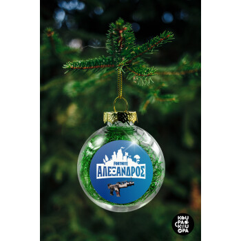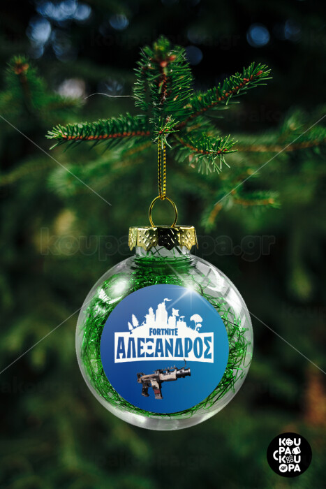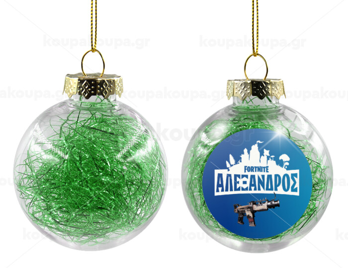Fortnite with gun με το όνομα σου, Στολίδι Χριστουγεννιάτικη μπάλα δένδρου διάφανη με πράσινο γέμισμα 8cm