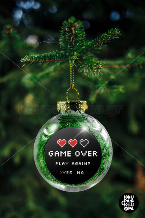GAME OVER, Play again? YES - NO, Στολίδι Χριστουγεννιάτικη μπάλα δένδρου διάφανη με πράσινο γέμισμα 8cm