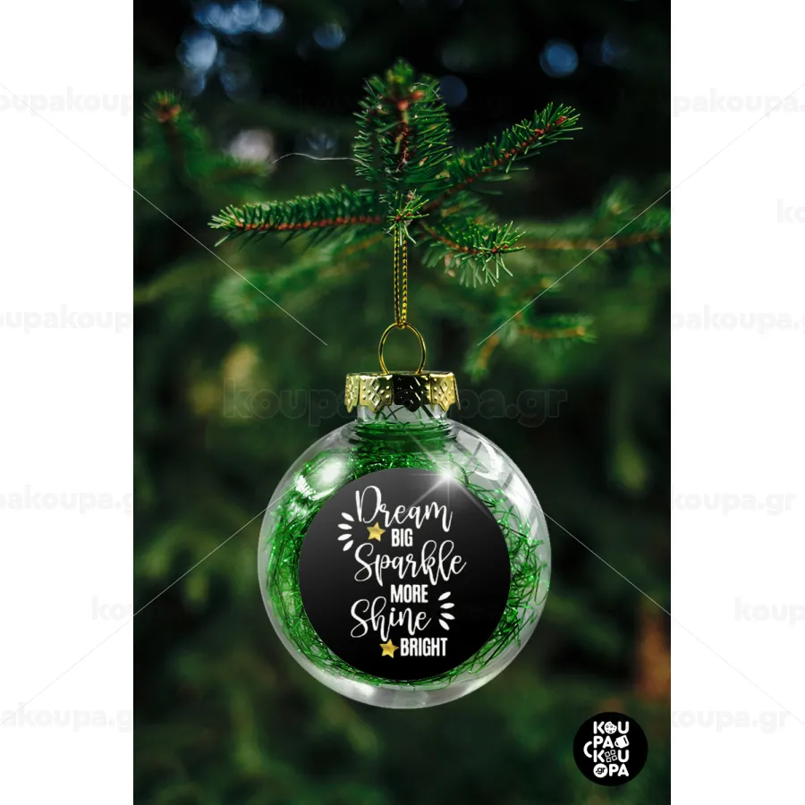 Dream big, Sparkle more, Shine bright, Στολίδι Χριστουγεννιάτικη μπάλα δένδρου διάφανη με πράσινο γέμισμα 8cm