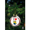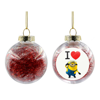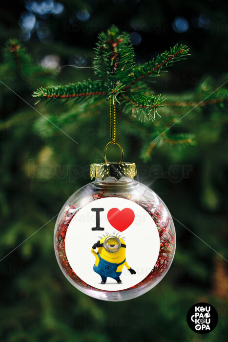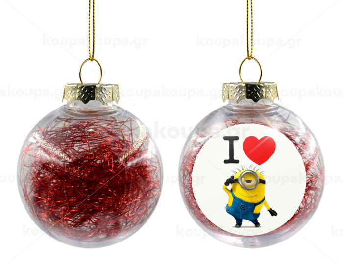 I love by minion, Στολίδι Χριστουγεννιάτικη μπάλα δένδρου διάφανη με κόκκινο γέμισμα 8cm