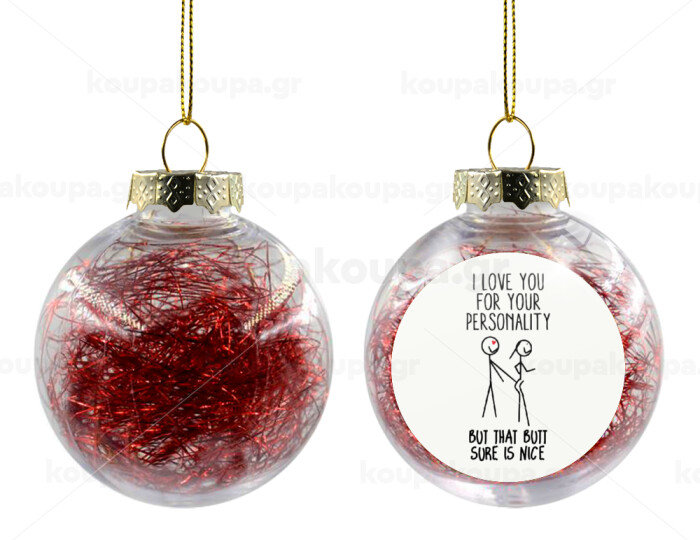 I Love you for your personality, Στολίδι Χριστουγεννιάτικη μπάλα δένδρου διάφανη με κόκκινο γέμισμα 8cm