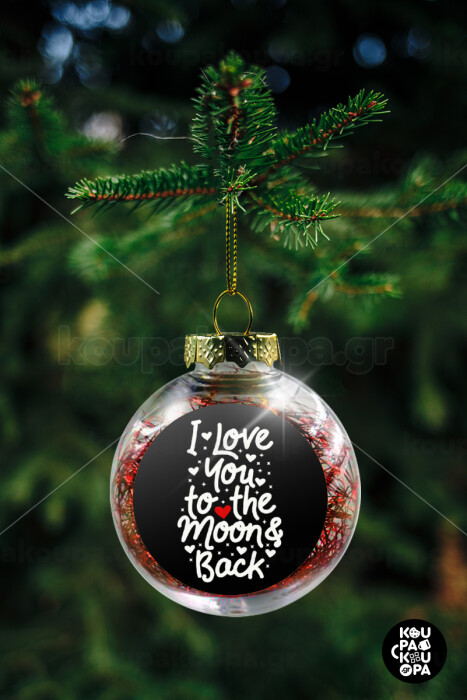 I love you to the moon and back with hearts, Στολίδι Χριστουγεννιάτικη μπάλα δένδρου διάφανη με κόκκινο γέμισμα 8cm