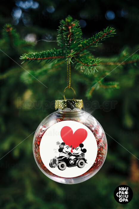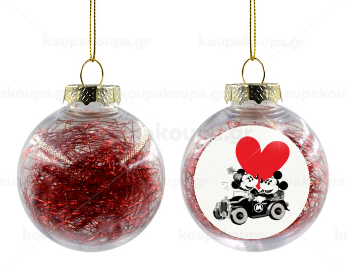Mickey & Minnie love car, Στολίδι Χριστουγεννιάτικη μπάλα δένδρου διάφανη με κόκκινο γέμισμα 8cm