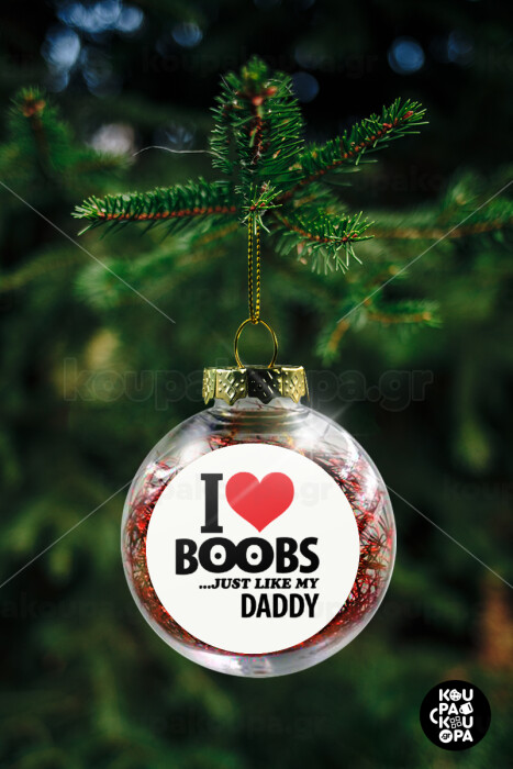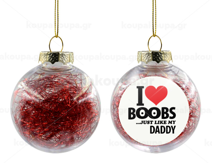 I Love boobs ...just like my daddy, Στολίδι Χριστουγεννιάτικη μπάλα δένδρου διάφανη με κόκκινο γέμισμα 8cm