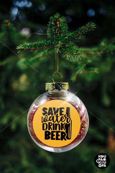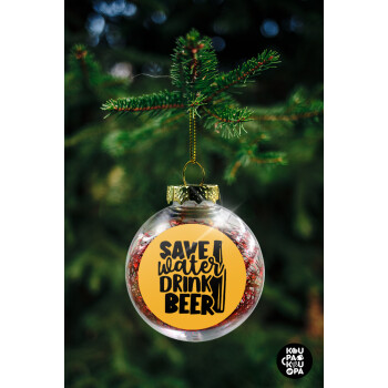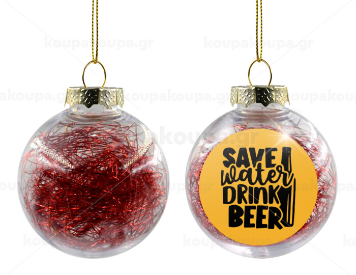 Save Water, Drink BEER, Στολίδι Χριστουγεννιάτικη μπάλα δένδρου διάφανη με κόκκινο γέμισμα 8cm